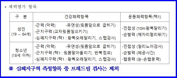 성인(19~64세)을 대상으로 하는 체력평가 항목은 다음과 같습니다:
