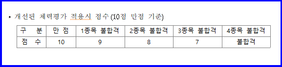 - 3등급 미만 :건강체력 4개 항목 중 불합격 항목 수에 따라 체력평가 배점의 10% 감점 4개 항목 모두 불합격 시, 불합격 처리
