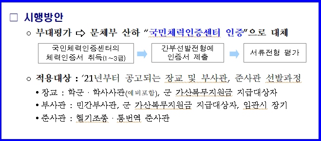 2021년부터 적용된 장교, 부사관, 준사관 선발 과정에서는 모든 지원자가 체력인증서를 제출해야 합니다. 각 등급에 따른 체력인증서를 갖춰야 서류 심사와 최종 평가에서 우수한 점수를 받을 수 있으니 체력 준비는 철저히 해주세요.