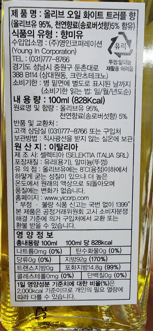 원료명 및 함량 | 올리브유 95%, 천연향료(송로버섯향) 5% |
